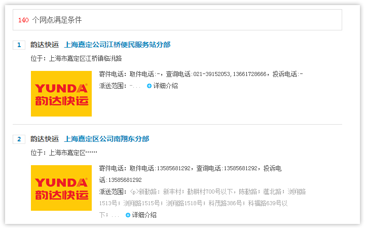 2、查詢(xún)結(jié)果頁(yè)面顯示符合條件的快遞公司網(wǎng)點(diǎn)列表,顯示快遞網(wǎng)點(diǎn)所在區(qū)域,公司地址和聯(lián)系電話,如需查看更多信息,點(diǎn)擊 【查看詳情】進(jìn)入網(wǎng)點(diǎn)詳細(xì)頁(yè)面查看。