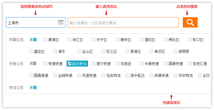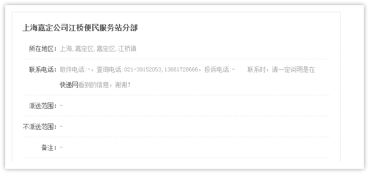 1、進(jìn)入 2、查詢(xún)結(jié)果頁(yè)面顯示符合條件的快遞公司網(wǎng)點(diǎn)列表,顯示快遞網(wǎng)點(diǎn)所在區(qū)域,公司地址和聯(lián)系電話,如需查看更多信息,點(diǎn)擊 【查看詳情】進(jìn)入網(wǎng)點(diǎn)詳細(xì)頁(yè)面查看。 3、點(diǎn)擊網(wǎng)點(diǎn)名,即可進(jìn)入網(wǎng)點(diǎn)詳情頁(yè)查看詳細(xì)信息。