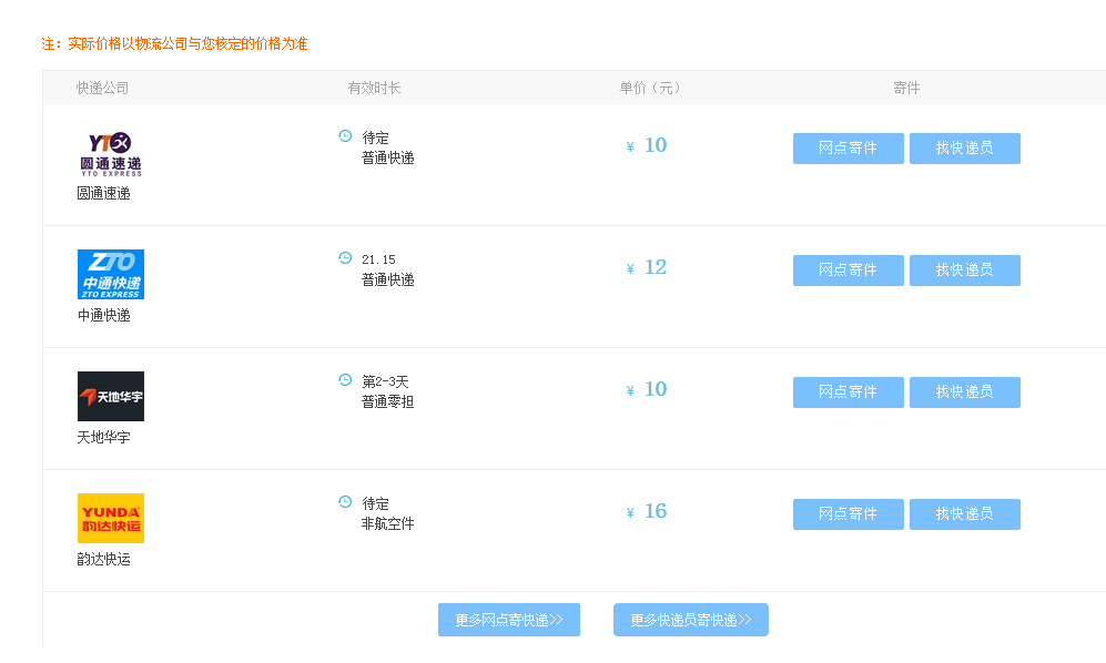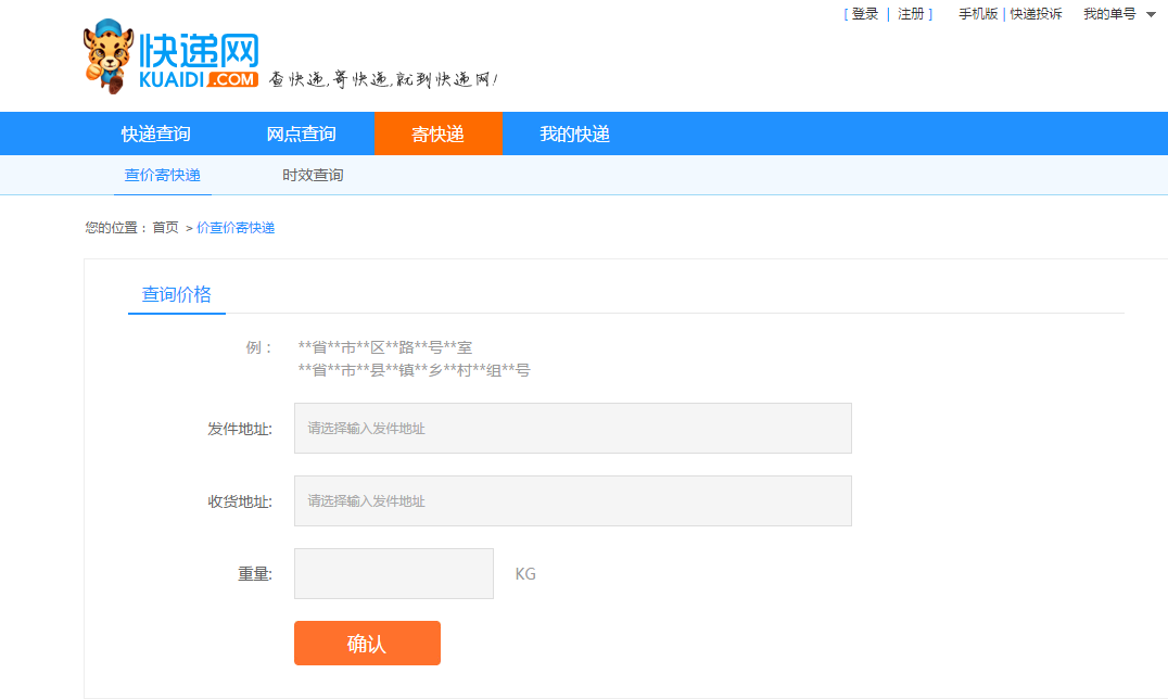 第二步:在“發(fā)件地址”選擇寄件地址,“收件地址”選擇目的地,重量輸入要寄的物品的重量,點(diǎn)“確認(rèn)”,頁(yè)面會(huì)顯示可以到以選用的快遞,如下圖所示。其中可以看到有“網(wǎng)點(diǎn)寄件”和“找快遞員”