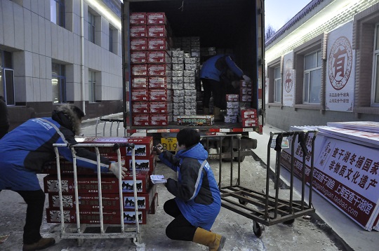 查干湖冬捕,即查干湖冬季冰雪漁獵,是一種極其傳統(tǒng)的漁業(yè)生產(chǎn)方式,始于史前、盛于遼金,延續(xù)至今千年未變,當(dāng)?shù)貪O民被稱為“最后的漁獵部落”。12月末到春節(jié)前是查干湖冬捕的黃金時(shí)間,漁民借助馬拉絞盤的力量在冰下行網(wǎng)捕魚(yú),其盛大的場(chǎng)景每年都吸引著數(shù)萬(wàn)國(guó)內(nèi)外游客前來(lái)觀看。2011年,中通吉林松原公司開(kāi)通了查干湖承包區(qū),推出了“大美查干湖、中通鮮到家”的宣傳口號(hào),并自行購(gòu)置加厚紙箱、保溫箱等專業(yè)包裝材料,為寄遞客戶提供免費(fèi)包裝服務(wù)。如今,查干湖分部承包區(qū)日發(fā)件量500票以上,名列松原公司首位,也為查干湖魚(yú)的對(duì)外銷售打開(kāi)了一條新通道。